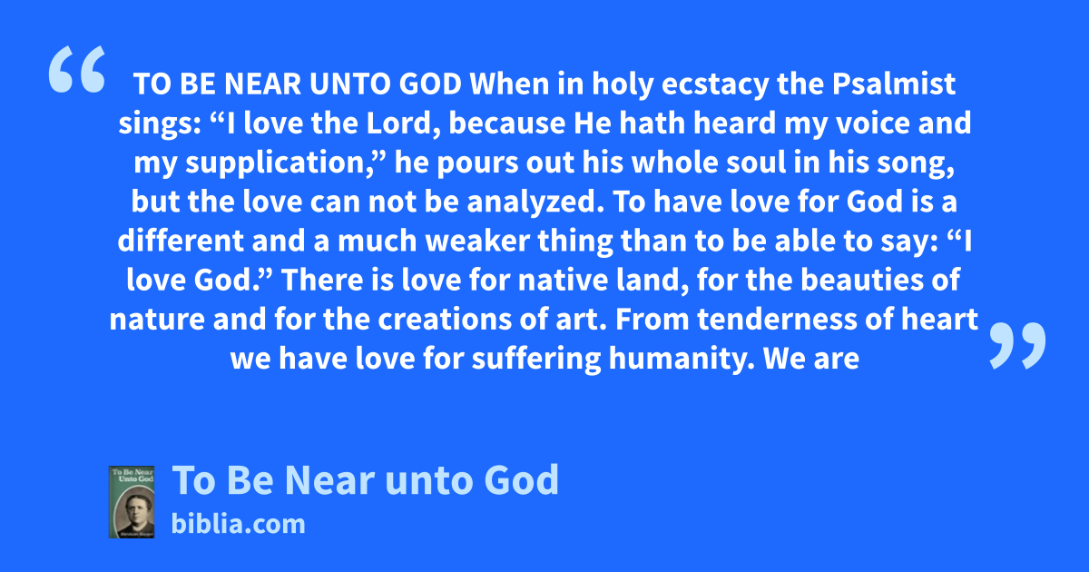 TO BE NEAR UNTO GOD When in holy ecstacy the Psalmist sings: “I love the Lord, because He hath heard my voice and my supplication,” he pours out his whole soul in his song, but the love can not be analyzed. To have love for God is a different and a much weaker thing than to be able to say: “I love God.” There is love for native land, for the beauties of nature and for the creations of art. From tenderness of heart we have love for suffering humanity. We are