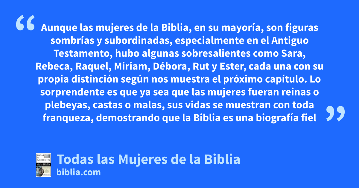 Aunque las mujeres de la Biblia, en su mayoría, son figuras sombrías y subordinadas, especialmente en el Antiguo Testamento, hubo algunas sobresalientes como Sara, Rebeca, Raquel, Miriam, Débora, Rut y Ester, cada una con su propia distinción según nos muestra el próximo capítulo. Lo sorprendente es que ya sea que las mujeres fueran reinas o plebeyas, castas o malas, sus vidas se muestran con toda franqueza, demostrando que la Biblia es una biografía fiel