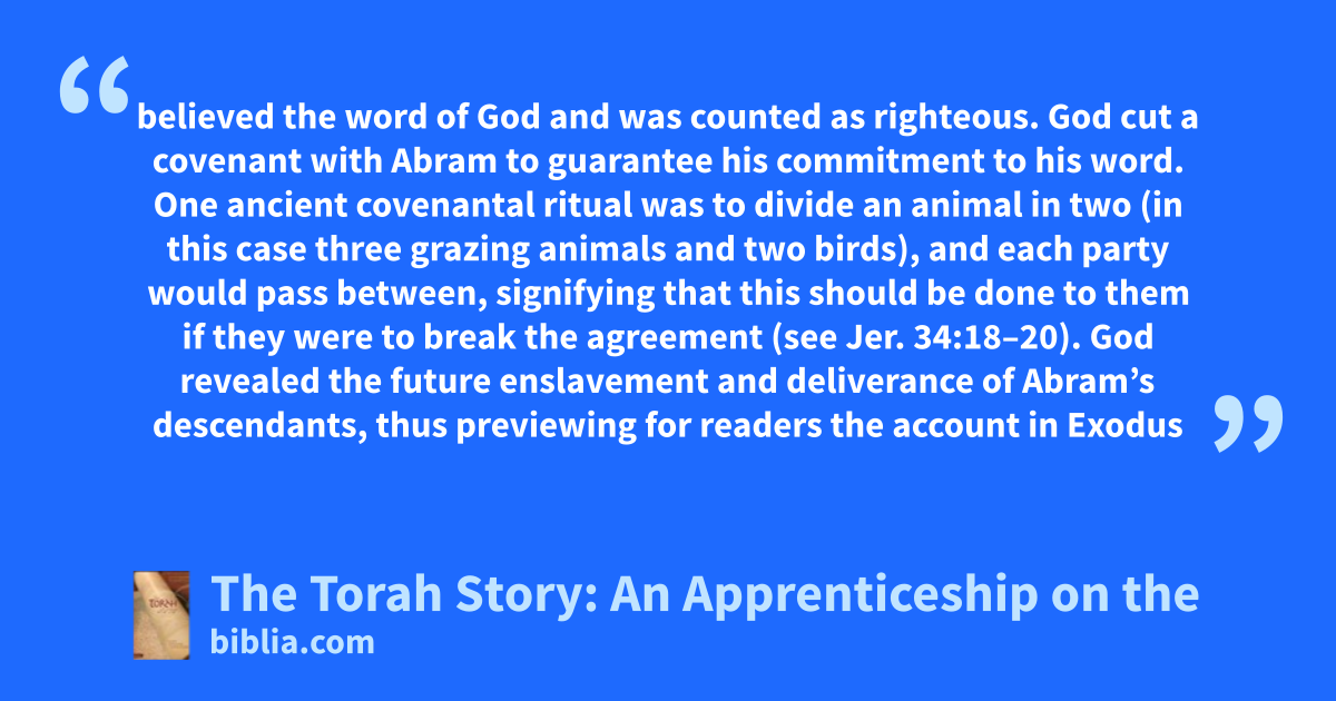 believed the word of God and was counted as righteous. God cut a covenant with Abram to guarantee his commitment to his word. One ancient covenantal ritual was to divide an animal in two (in this case three grazing animals and two birds), and each party would pass between, signifying that this should be done to them if they were to break the agreement (see Jer. 34:18–20). God revealed the future enslavement and deliverance of Abram’s descendants, thus previewing for readers the account in Exodus