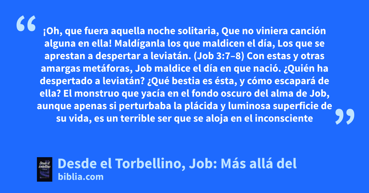 ¡Oh, que fuera aquella noche solitaria, Que no viniera canción alguna en ella! Maldíganla los que maldicen el día, Los que se aprestan a despertar a leviatán. (Job 3:7–8) Con estas y otras amargas metáforas, Job maldice el día en que nació. ¿Quién ha despertado a leviatán? ¿Qué bestia es ésta, y cómo escapará de ella? El monstruo que yacía en el fondo oscuro del alma de Job, aunque apenas si perturbaba la plácida y luminosa superficie de su vida, es un terrible ser que se aloja en el inconsciente