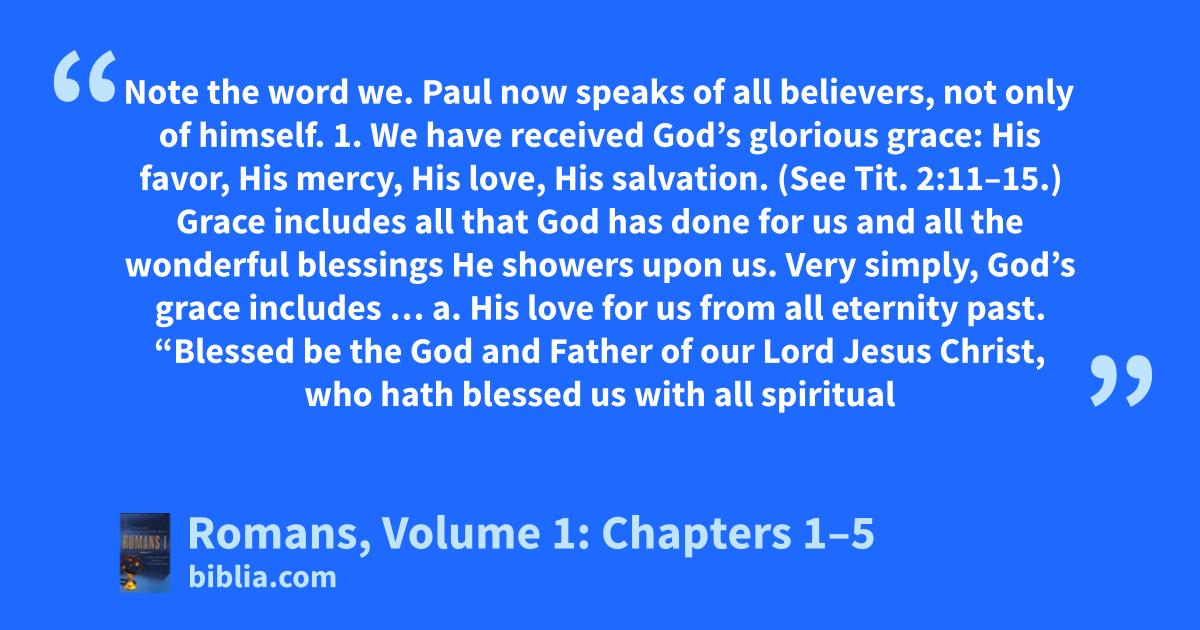 Note the word we. Paul now speaks of all believers, not only of himself. 1. We have received God’s glorious grace: His favor, His mercy, His love, His salvation. (See Tit. 2:11–15.) Grace includes all that God has done for us and all the wonderful blessings He showers upon us. Very simply, God’s grace includes … a. His love for us from all eternity past. “Blessed be the God and Father of our Lord Jesus Christ, who hath blessed us with all spiritual