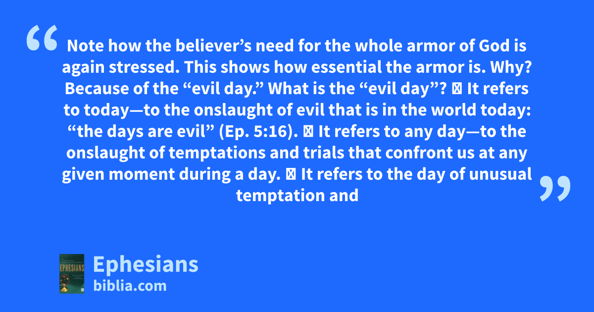 Note how the believer’s need for the whole armor of God is again stressed. This shows how essential the armor is. Why? Because of the “evil day.” What is the “evil day”? ⇒ It refers to today—to the onslaught of evil that is in the world today: “the days are evil” (Ep. 5:16). ⇒ It refers to any day—to the onslaught of temptations and trials that confront us at any given moment during a day. ⇒ It refers to the day of unusual temptation and