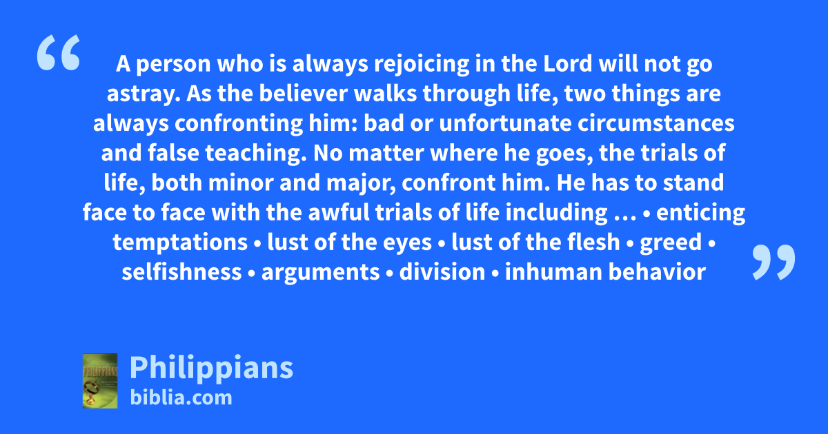 A person who is always rejoicing in the Lord will not go astray. As the believer walks through life, two things are always confronting him: bad or unfortunate circumstances and false teaching. No matter where he goes, the trials of life, both minor and major, confront him. He has to stand face to face with the awful trials of life including … • enticing temptations • lust of the eyes • lust of the flesh • greed • selfishness • arguments • division • inhuman behavior