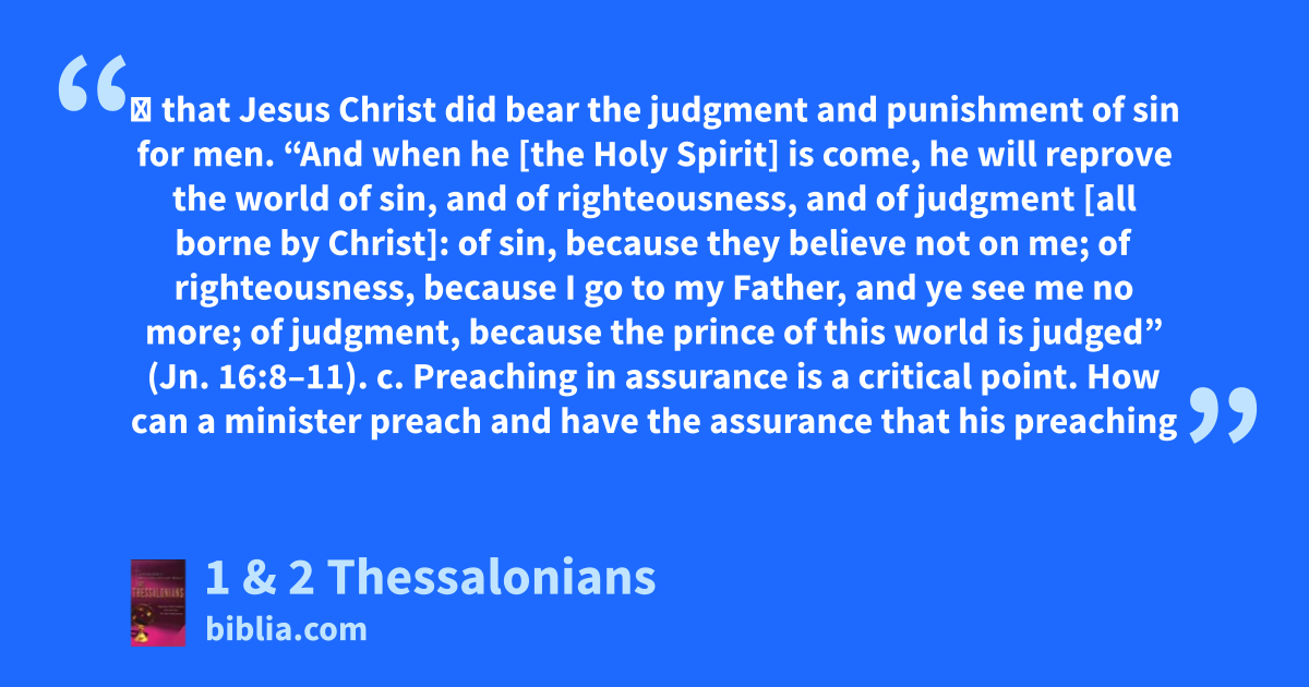 ⇒ that Jesus Christ did bear the judgment and punishment of sin for men. “And when he [the Holy Spirit] is come, he will reprove the world of sin, and of righteousness, and of judgment [all borne by Christ]: of sin, because they believe not on me; of righteousness, because I go to my Father, and ye see me no more; of judgment, because the prince of this world is judged” (Jn. 16:8–11). c. Preaching in assurance is a critical point. How can a minister preach and have the assurance that his preaching