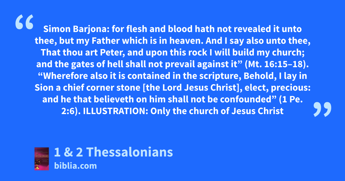Simon Barjona: for flesh and blood hath not revealed it unto thee, but my Father which is in heaven. And I say also unto thee, That thou art Peter, and upon this rock I will build my church; and the gates of hell shall not prevail against it” (Mt. 16:15–18). “Wherefore also it is contained in the scripture, Behold, I lay in Sion a chief corner stone [the Lord Jesus Christ], elect, precious: and he that believeth on him shall not be confounded” (1 Pe. 2:6). ILLUSTRATION: Only the church of Jesus Christ