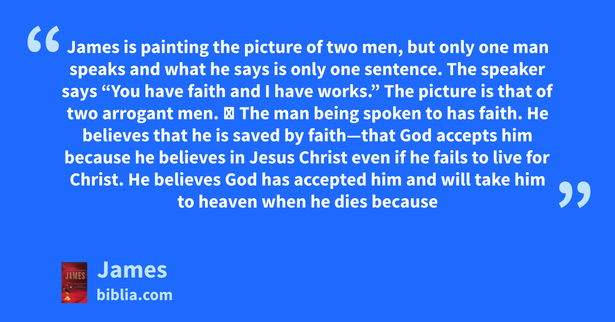 James is painting the picture of two men, but only one man speaks and what he says is only one sentence. The speaker says “You have faith and I have works.” The picture is that of two arrogant men. ⇒ The man being spoken to has faith. He believes that he is saved by faith—that God accepts him because he believes in Jesus Christ even if he fails to live for Christ. He believes God has accepted him and will take him to heaven when he dies because