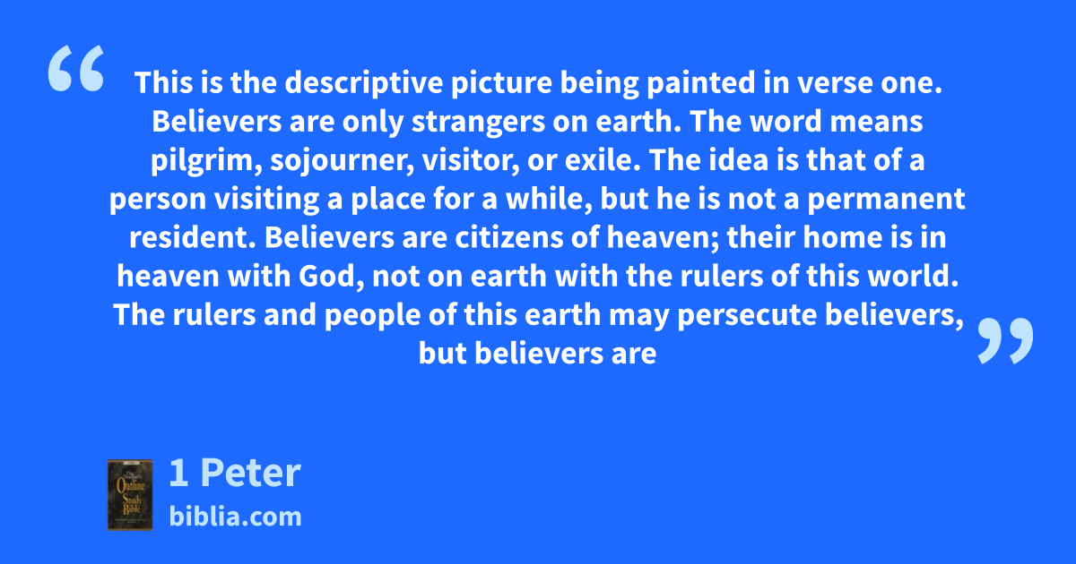 This is the descriptive picture being painted in verse one. Believers are only strangers on earth. The word means pilgrim, sojourner, visitor, or exile. The idea is that of a person visiting a place for a while, but he is not a permanent resident. Believers are citizens of heaven; their home is in heaven with God, not on earth with the rulers of this world. The rulers and people of this earth may persecute believers, but believers are