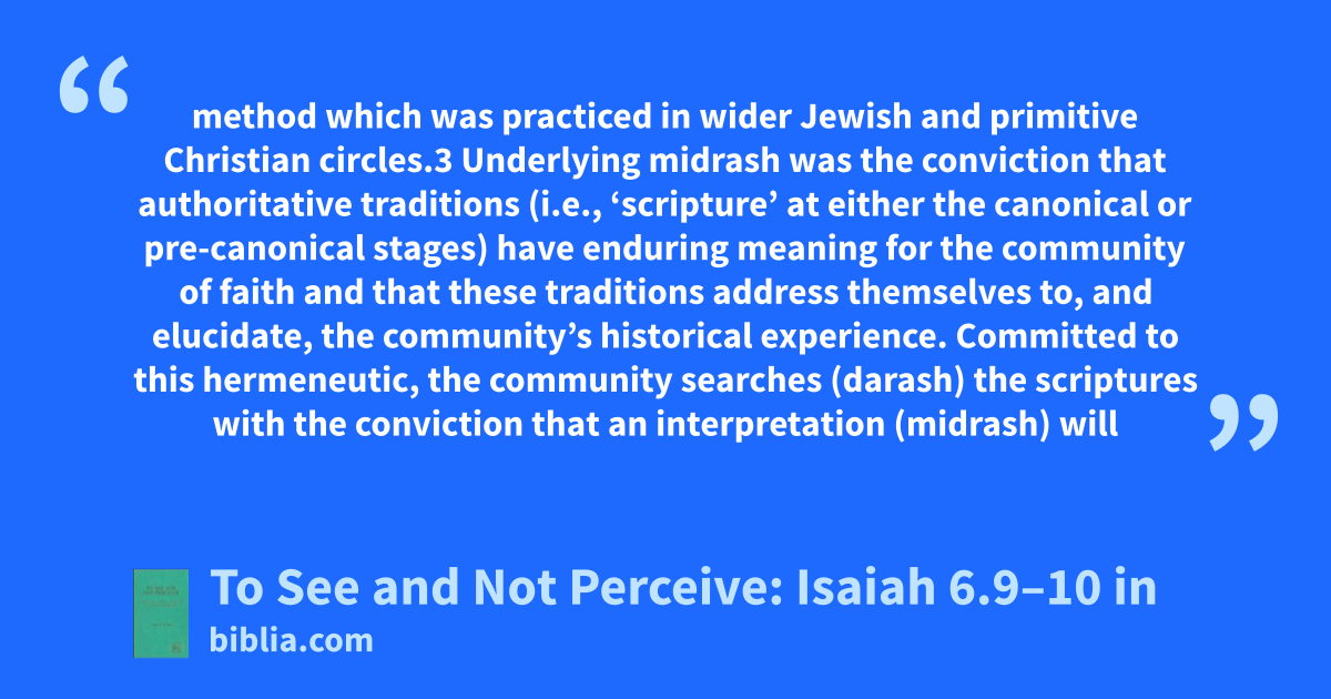 method which was practiced in wider Jewish and primitive Christian circles.3 Underlying midrash was the conviction that authoritative traditions (i.e., ‘scripture’ at either the canonical or pre-canonical stages) have enduring meaning for the community of faith and that these traditions address themselves to, and elucidate, the community’s historical experience. Committed to this hermeneutic, the community searches (darash) the scriptures with the conviction that an interpretation (midrash) will