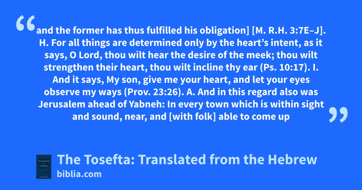 and the former has thus fulfilled his obligation] [M. R.H. 3:7E–J]. H. For all things are determined only by the heart’s intent, as it says, O Lord, thou wilt hear the desire of the meek; thou wilt strengthen their heart, thou wilt incline thy ear (Ps. 10:17). I. And it says, My son, give me your heart, and let your eyes observe my ways (Prov. 23:26). A. And in this regard also was Jerusalem ahead of Yabneh: In every town which is within sight and sound, near, and [with folk] able to come up