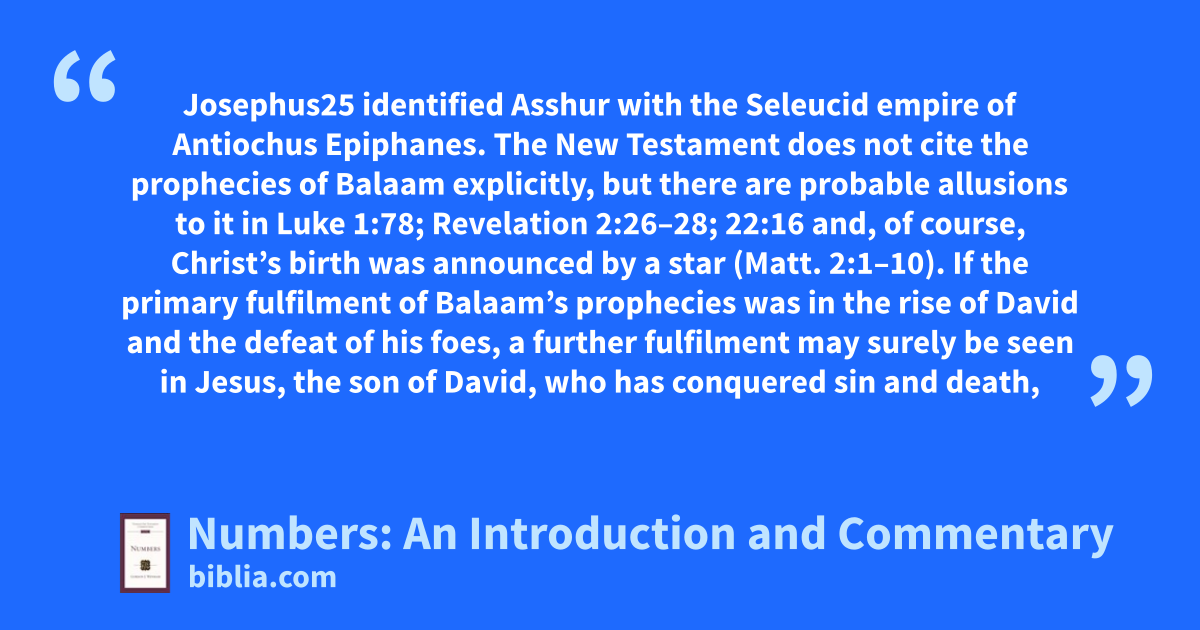 Josephus25 identified Asshur with the Seleucid empire of Antiochus Epiphanes. The New Testament does not cite the prophecies of Balaam explicitly, but there are probable allusions to it in Luke 1:78; Revelation 2:26–28; 22:16 and, of course, Christ’s birth was announced by a star (Matt. 2:1–10). If the primary fulfilment of Balaam’s prophecies was in the rise of David and the defeat of his foes, a further fulfilment may surely be seen in Jesus, the son of David, who has conquered sin and death,