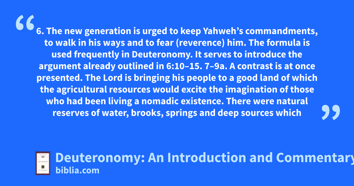 6. The new generation is urged to keep Yahweh’s commandments, to walk in his ways and to fear (reverence) him. The formula is used frequently in Deuteronomy. It serves to introduce the argument already outlined in 6:10–15. 7–9a. A contrast is at once presented. The Lord is bringing his people to a good land of which the agricultural resources would excite the imagination of those who had been living a nomadic existence. There were natural reserves of water, brooks, springs and deep sources which