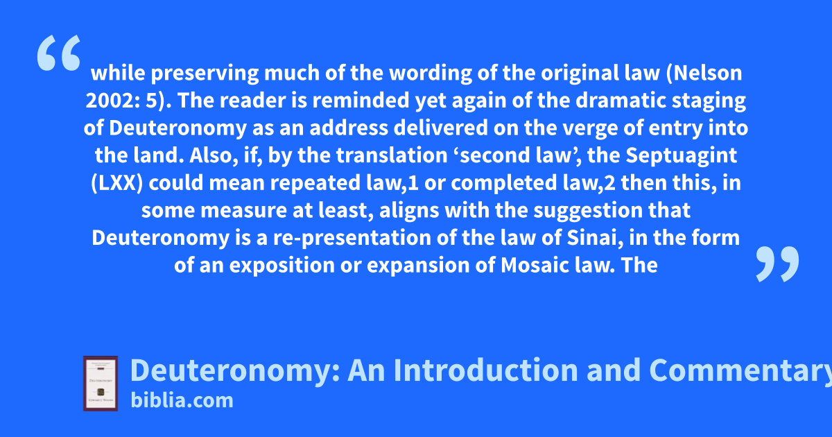 while preserving much of the wording of the original law (Nelson 2002: 5). The reader is reminded yet again of the dramatic staging of Deuteronomy as an address delivered on the verge of entry into the land. Also, if, by the translation ‘second law’, the Septuagint (LXX) could mean repeated law,1 or completed law,2 then this, in some measure at least, aligns with the suggestion that Deuteronomy is a re-presentation of the law of Sinai, in the form of an exposition or expansion of Mosaic law. The
