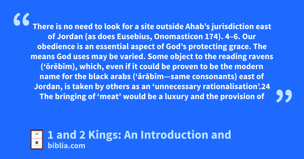 There is no need to look for a site outside Ahab’s jurisdiction east of Jordan (as does Eusebius, Onomasticon 174). 4–6. Our obedience is an essential aspect of God’s protecting grace. The means God uses may be varied. Some object to the reading ravens (‘ōrĕbîm), which, even if it could be proven to be the modern name for the black arabs (‘ǎrābîm—same consonants) east of Jordan, is taken by others as an ‘unnecessary rationalisation’.24 The bringing of ‘meat’ would be a luxury and the provision of