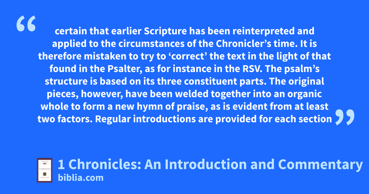 certain that earlier Scripture has been reinterpreted and applied to the circumstances of the Chronicler’s time. It is therefore mistaken to try to ‘correct’ the text in the light of that found in the Psalter, as for instance in the RSV. The psalm’s structure is based on its three constituent parts. The original pieces, however, have been welded together into an organic whole to form a new hymn of praise, as is evident from at least two factors. Regular introductions are provided for each section