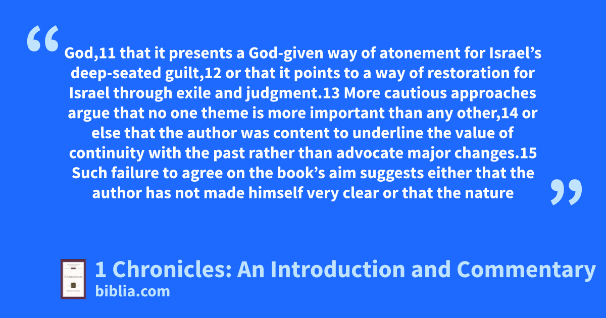 God,11 that it presents a God-given way of atonement for Israel’s deep-seated guilt,12 or that it points to a way of restoration for Israel through exile and judgment.13 More cautious approaches argue that no one theme is more important than any other,14 or else that the author was content to underline the value of continuity with the past rather than advocate major changes.15 Such failure to agree on the book’s aim suggests either that the author has not made himself very clear or that the nature