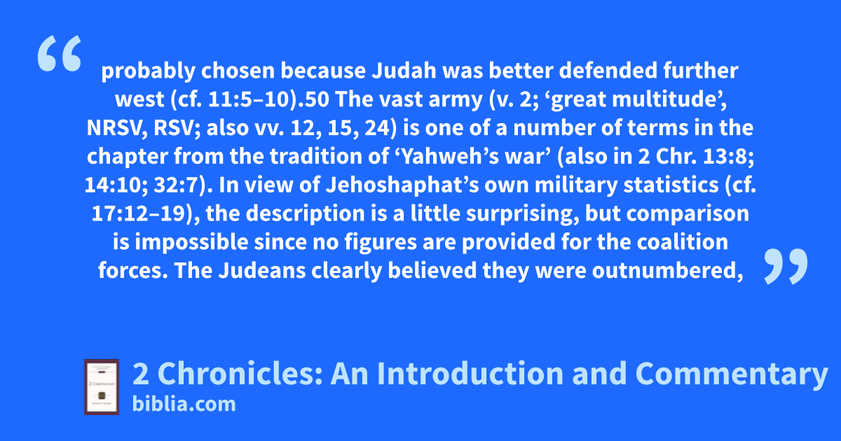 probably chosen because Judah was better defended further west (cf. 11:5–10).50 The vast army (v. 2; ‘great multitude’, NRSV, RSV; also vv. 12, 15, 24) is one of a number of terms in the chapter from the tradition of ‘Yahweh’s war’ (also in 2 Chr. 13:8; 14:10; 32:7). In view of Jehoshaphat’s own military statistics (cf. 17:12–19), the description is a little surprising, but comparison is impossible since no figures are provided for the coalition forces. The Judeans clearly believed they were outnumbered,