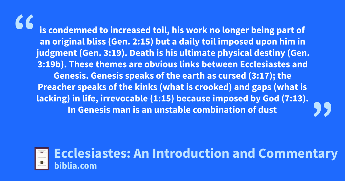 is condemned to increased toil, his work no longer being part of an original bliss (Gen. 2:15) but a daily toil imposed upon him in judgment (Gen. 3:19). Death is his ultimate physical destiny (Gen. 3:19b). These themes are obvious links between Ecclesiastes and Genesis. Genesis speaks of the earth as cursed (3:17); the Preacher speaks of the kinks (what is crooked) and gaps (what is lacking) in life, irrevocable (1:15) because imposed by God (7:13). In Genesis man is an unstable combination of dust