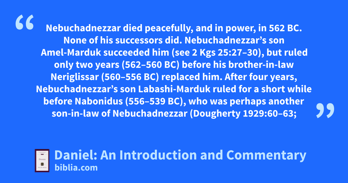 Nebuchadnezzar died peacefully, and in power, in 562 BC. None of his successors did. Nebuchadnezzar’s son Amel-Marduk succeeded him (see 2 Kgs 25:27–30), but ruled only two years (562–560 BC) before his brother-in-law Neriglissar (560–556 BC) replaced him. After four years, Nebuchadnezzar’s son Labashi-Marduk ruled for a short while before Nabonidus (556–539 BC), who was perhaps another son-in-law of Nebuchadnezzar (Dougherty 1929:60–63;