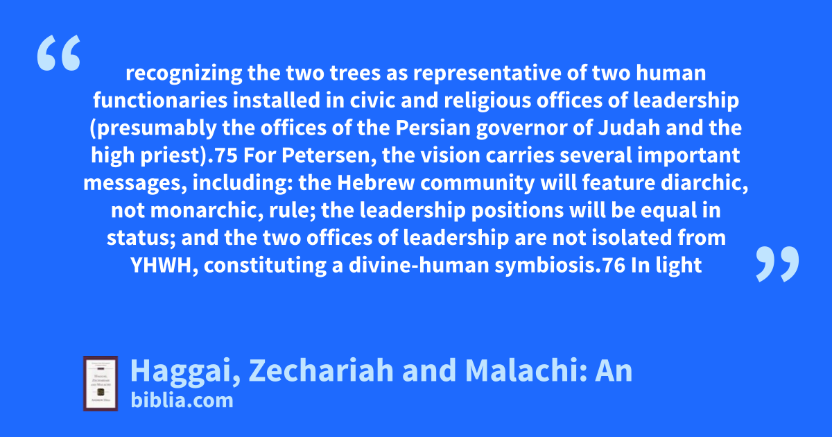 recognizing the two trees as representative of two human functionaries installed in civic and religious offices of leadership (presumably the offices of the Persian governor of Judah and the high priest).75 For Petersen, the vision carries several important messages, including: the Hebrew community will feature diarchic, not monarchic, rule; the leadership positions will be equal in status; and the two offices of leadership are not isolated from YHWH, constituting a divine-human symbiosis.76 In light