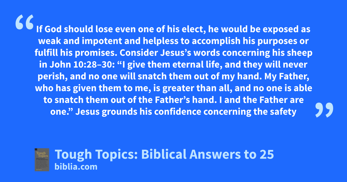 If God should lose even one of his elect, he would be exposed as weak and impotent and helpless to accomplish his purposes or fulfill his promises. Consider Jesus’s words concerning his sheep in John 10:28–30: “I give them eternal life, and they will never perish, and no one will snatch them out of my hand. My Father, who has given them to me, is greater than all, and no one is able to snatch them out of the Father’s hand. I and the Father are one.” Jesus grounds his confidence concerning the safety
