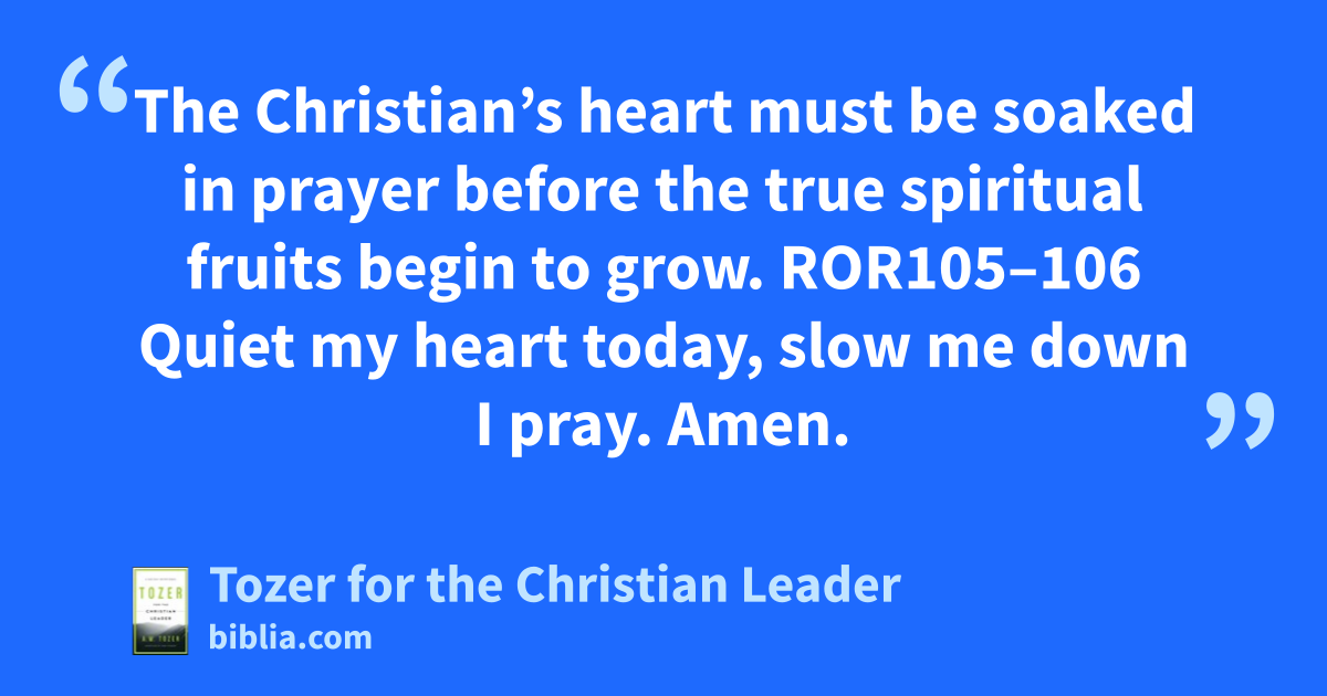The Christian’s heart must be soaked in prayer before the true spiritual fruits begin to grow. ROR105–106 Quiet my heart today, slow me down I pray. Amen.