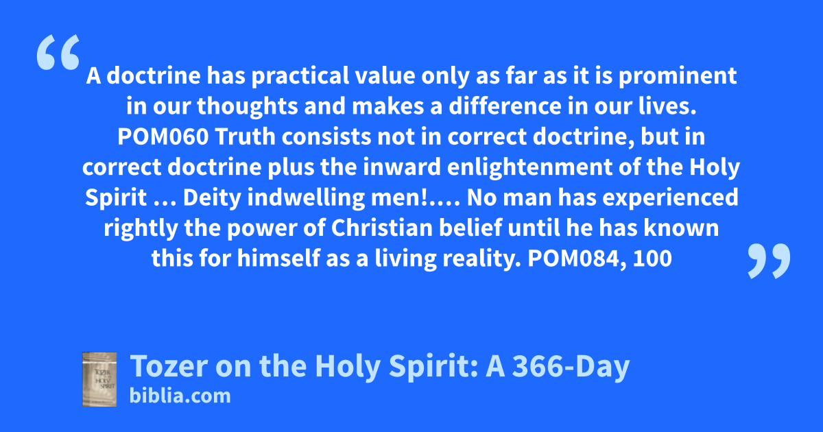 A doctrine has practical value only as far as it is prominent in our thoughts and makes a difference in our lives. POM060 Truth consists not in correct doctrine, but in correct doctrine plus the inward enlightenment of the Holy Spirit … Deity indwelling men!.… No man has experienced rightly the power of Christian belief until he has known this for himself as a living reality. POM084, 100