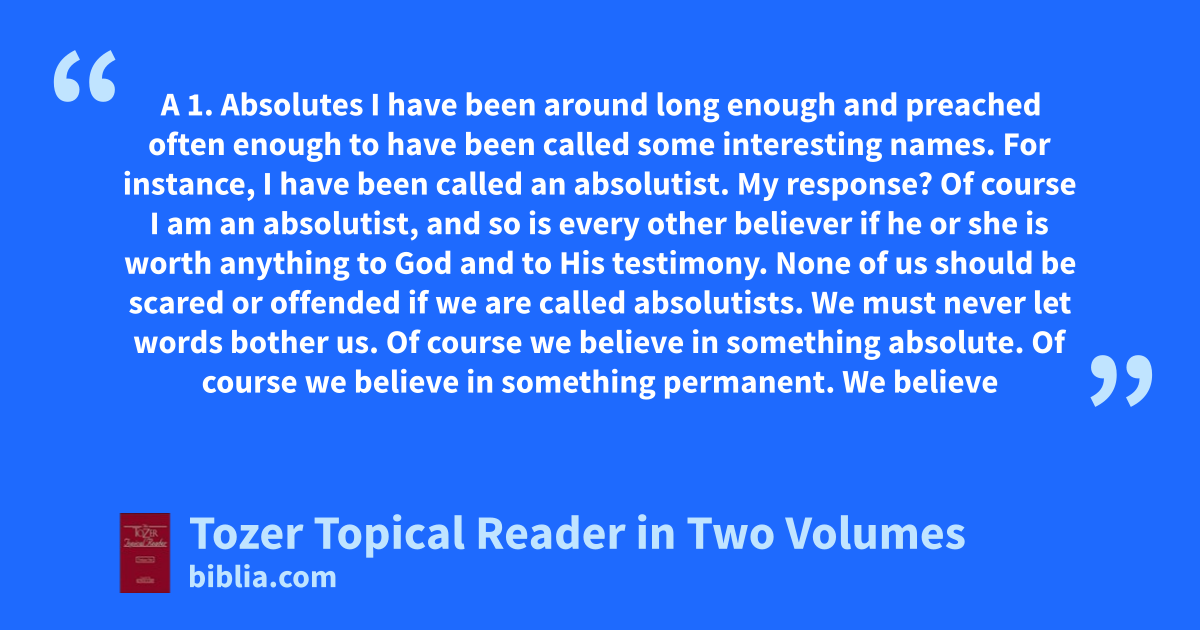 A 1. Absolutes I have been around long enough and preached often enough to have been called some interesting names. For instance, I have been called an absolutist. My response? Of course I am an absolutist, and so is every other believer if he or she is worth anything to God and to His testimony. None of us should be scared or offended if we are called absolutists. We must never let words bother us. Of course we believe in something absolute. Of course we believe in something permanent. We believe