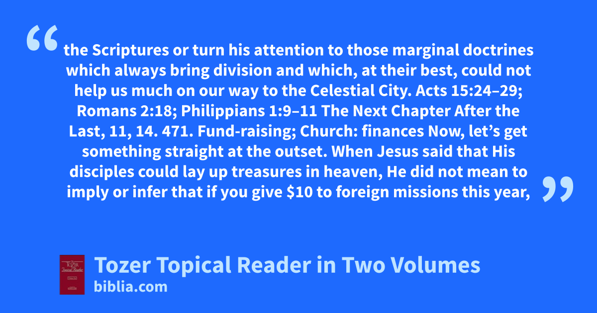the Scriptures or turn his attention to those marginal doctrines which always bring division and which, at their best, could not help us much on our way to the Celestial City. Acts 15:24–29; Romans 2:18; Philippians 1:9–11 The Next Chapter After the Last, 11, 14. 471. Fund-raising; Church: finances Now, let’s get something straight at the outset. When Jesus said that His disciples could lay up treasures in heaven, He did not mean to imply or infer that if you give $10 to foreign missions this year,