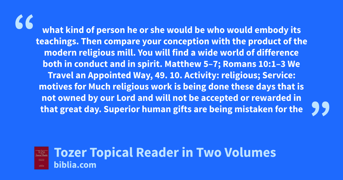 what kind of person he or she would be who would embody its teachings. Then compare your conception with the product of the modern religious mill. You will find a wide world of difference both in conduct and in spirit. Matthew 5–7; Romans 10:1–3 We Travel an Appointed Way, 49. 10. Activity: religious; Service: motives for Much religious work is being done these days that is not owned by our Lord and will not be accepted or rewarded in that great day. Superior human gifts are being mistaken for the
