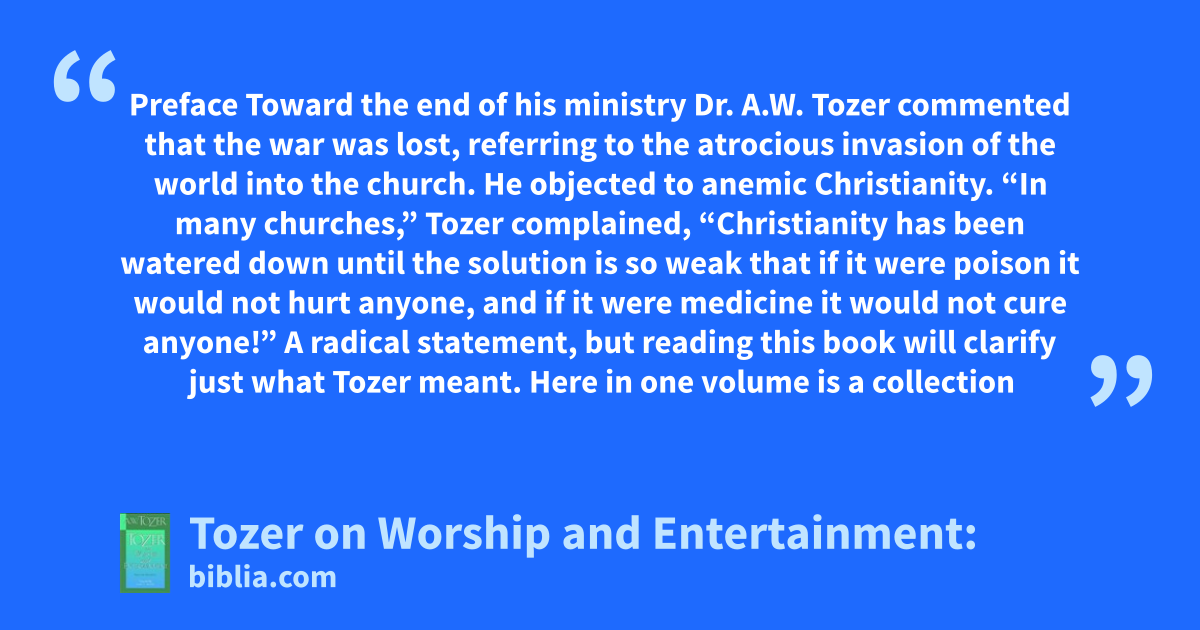 Here in one volume is a collection of Tozer’s thoughts on worship and entertainment chosen from taped recordings of his preaching and from editorials, columns and books, some previously unpublished. These selections are the essence of Tozer’s convictions on decadence within the Church. Also included is his essay, The Menace of the Religious Movie. Of worship, Tozer reminds us that it is “to feel...