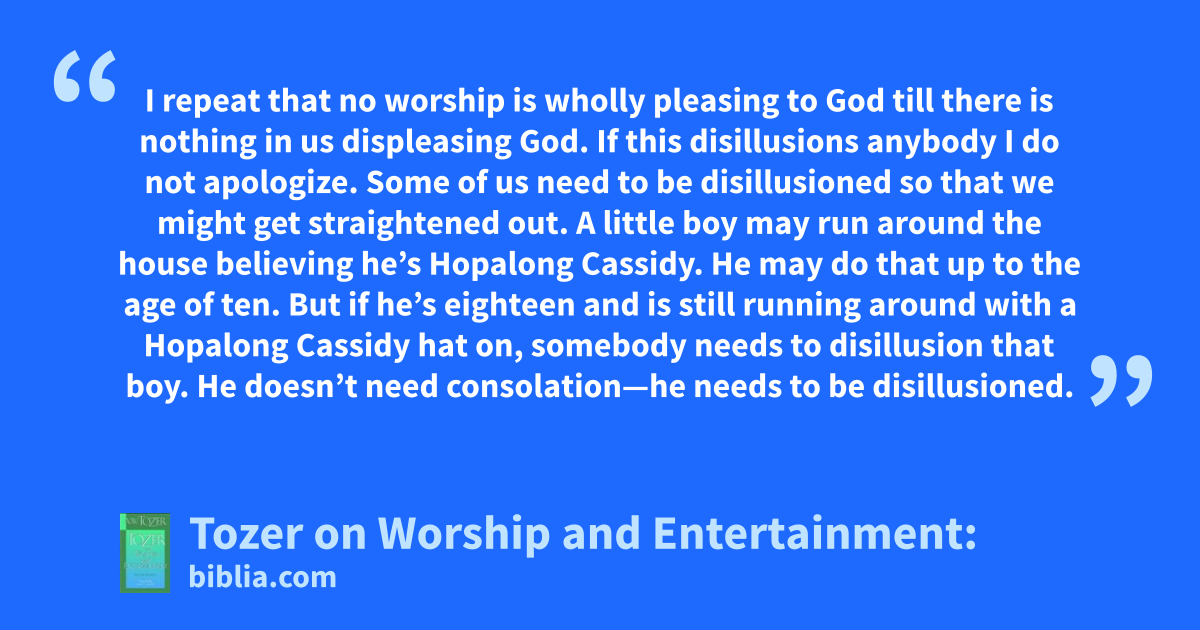 I repeat that no worship is wholly pleasing to God till there is nothing in us displeasing God. If this disillusions anybody I do not apologize. Some of us need to be disillusioned so that we might get straightened out. A little boy may run around the house believing he’s Hopalong Cassidy. He may do that up to the age of ten. But if he’s eighteen and is still running around with a Hopalong Cassidy hat on, somebody needs to disillusion that boy. He doesn’t need consolation—he needs to be disillusioned.