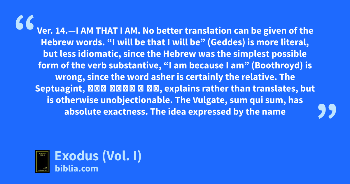 Ver. 14.—I AM THAT I AM. No better translation can be given of the Hebrew words. “I will be that I will be” (Geddes) is more literal, but less idiomatic, since the Hebrew was the simplest possible form of the verb substantive, “I am because I am” (Boothroyd) is wrong, since the word asher is certainly the relative. The Septuagint, Ἐγώ εἰμι δ ὤν, explains rather than translates, but is otherwise unobjectionable. The Vulgate, sum qui sum, has absolute exactness. The idea expressed by the name