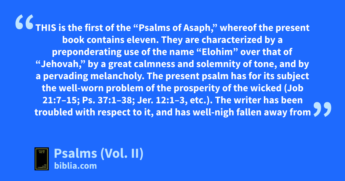 THIS is the first of the “Psalms of Asaph,” whereof the present book contains eleven. They are characterized by a preponderating use of the name “Elohim” over that of “Jehovah,” by a great calmness and solemnity of tone, and by a pervading melancholy. The present psalm has for its subject the well-worn problem of the prosperity of the wicked (Job 21:7–15; Ps. 37:1–38; Jer. 12:1–3, etc.). The writer has been troubled with respect to it, and has well-nigh fallen away from
