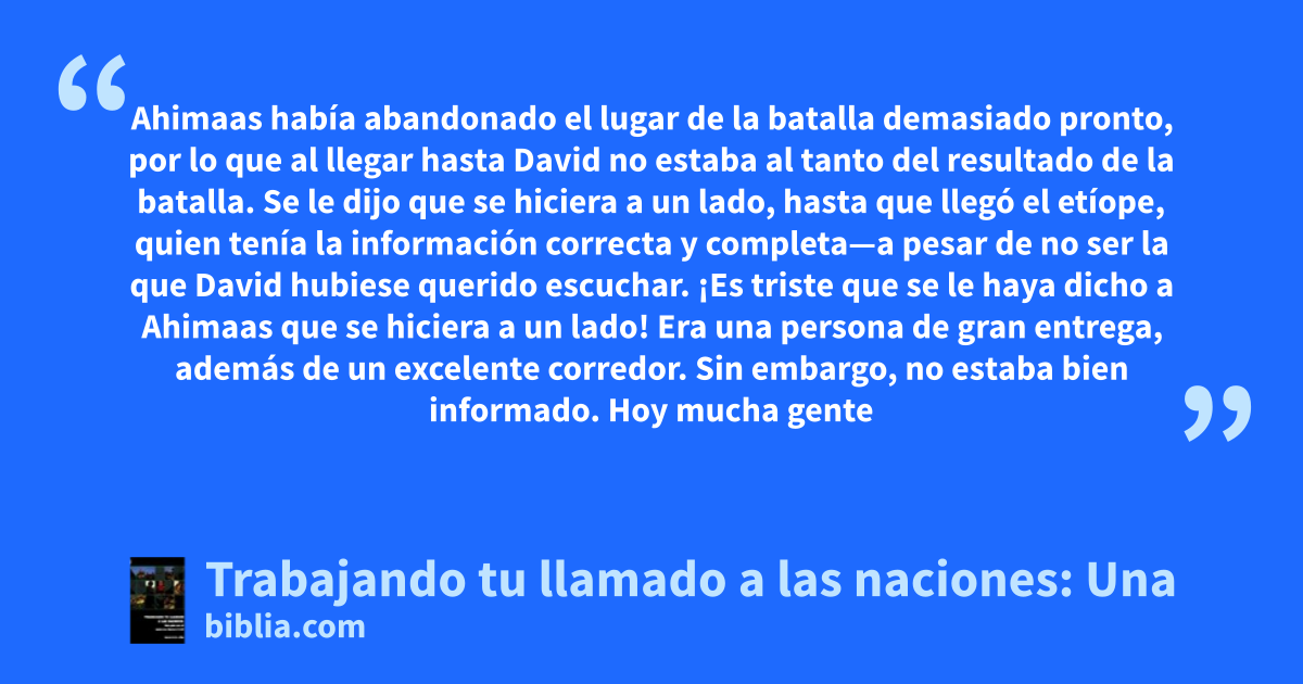 Ahimaas había abandonado el lugar de la batalla demasiado pronto, por lo que al llegar hasta David no estaba al tanto del resultado de la batalla. Se le dijo que se hiciera a un lado, hasta que llegó el etíope, quien tenía la información correcta y completa—a pesar de no ser la que David hubiese querido escuchar. ¡Es triste que se le haya dicho a Ahimaas que se hiciera a un lado! Era una persona de gran entrega, además de un excelente corredor. Sin embargo, no estaba bien informado. Hoy mucha gente