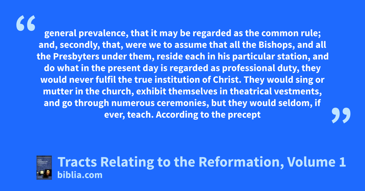 general prevalence, that it may be regarded as the common rule; and, secondly, that, were we to assume that all the Bishops, and all the Presbyters under them, reside each in his particular station, and do what in the present day is regarded as professional duty, they would never fulfil the true institution of Christ. They would sing or mutter in the church, exhibit themselves in theatrical vestments, and go through numerous ceremonies, but they would seldom, if ever, teach. According to the precept