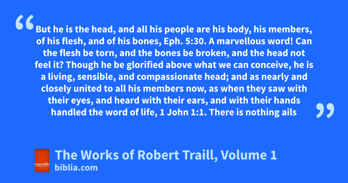 But he is the head, and all his people are his body, his members, of his flesh, and of his bones, Eph. 5:30. A marvellous word! Can the flesh be torn, and the bones be broken, and the head not feel it? Though he be glorified above what we can conceive, he is a living, sensible, and compassionate head; and as nearly and closely united to all his members now, as when they saw with their eyes, and heard with their ears, and with their hands handled the word of life, 1 John 1:1. There is nothing ails