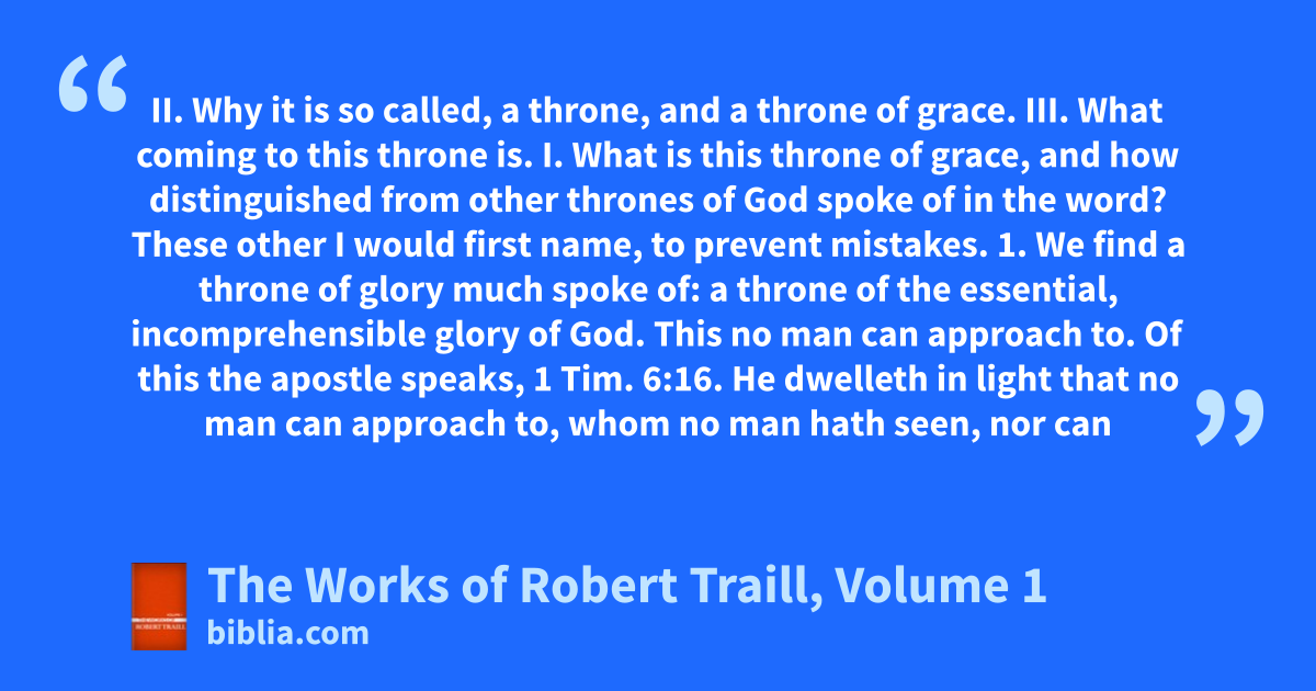 II. Why it is so called, a throne, and a throne of grace. III. What coming to this throne is. I. What is this throne of grace, and how distinguished from other thrones of God spoke of in the word? These other I would first name, to prevent mistakes. 1. We find a throne of glory much spoke of: a throne of the essential, incomprehensible glory of God. This no man can approach to. Of this the apostle speaks, 1 Tim. 6:16. He dwelleth in light that no man can approach to, whom no man hath seen, nor can
