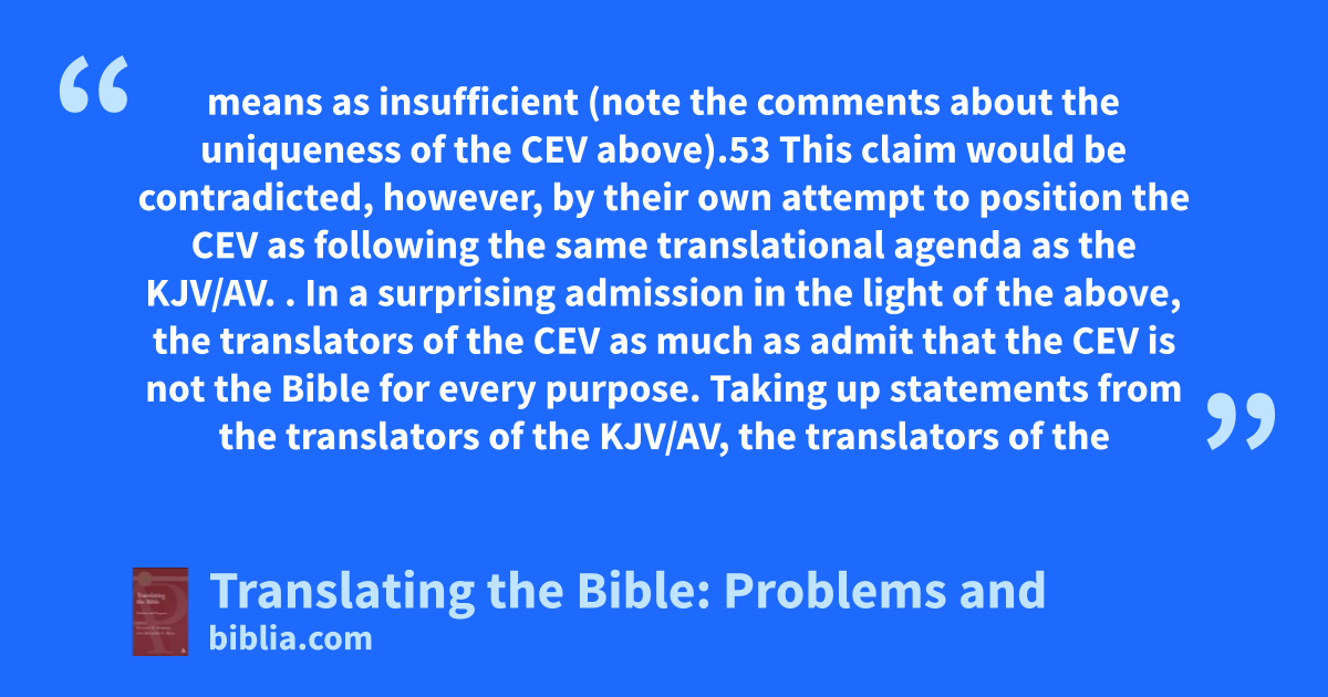 means as insufficient (note the comments about the uniqueness of the CEV above).53 This claim would be contradicted, however, by their own attempt to position the CEV as following the same translational agenda as the KJV/AV. . In a surprising admission in the light of the above, the translators of the CEV as much as admit that the CEV is not the Bible for every purpose. Taking up statements from the translators of the KJV/AV, the translators of the