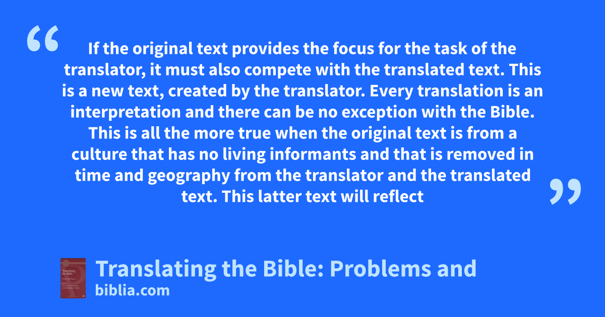 If the original text provides the focus for the task of the translator, it must also compete with the translated text. This is a new text, created by the translator. Every translation is an interpretation and there can be no exception with the Bible. This is all the more true when the original text is from a culture that has no living informants and that is removed in time and geography from the translator and the translated text. This latter text will reflect