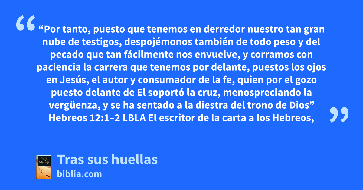 “Por tanto, puesto que tenemos en derredor nuestro tan gran nube de testigos, despojémonos también de todo peso y del pecado que tan fácilmente nos envuelve, y corramos con paciencia la carrera que tenemos por delante, puestos los ojos en Jesús, el autor y consumador de la fe, quien por el gozo puesto delante de El soportó la cruz, menospreciando la vergüenza, y se ha sentado a la diestra del trono de Dios” Hebreos 12:1–2 LBLA El escritor de la carta a los Hebreos,