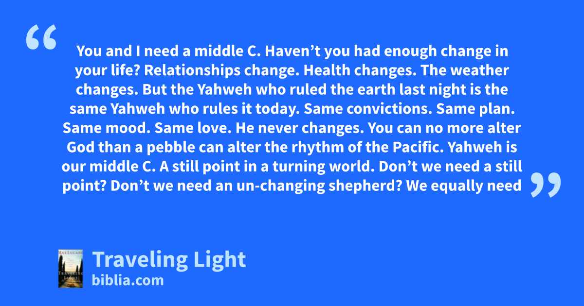 You and I need a middle C. Haven’t you had enough change in your life? Relationships change. Health changes. The weather changes. But the Yahweh who ruled the earth last night is the same Yahweh who rules it today. Same convictions. Same plan. Same mood. Same love. He never changes. You can no more alter God than a pebble can alter the rhythm of the Pacific. Yahweh is our middle C. A still point in a turning world. Don’t we need a still point? Don’t we need an un-changing shepherd? We equally need