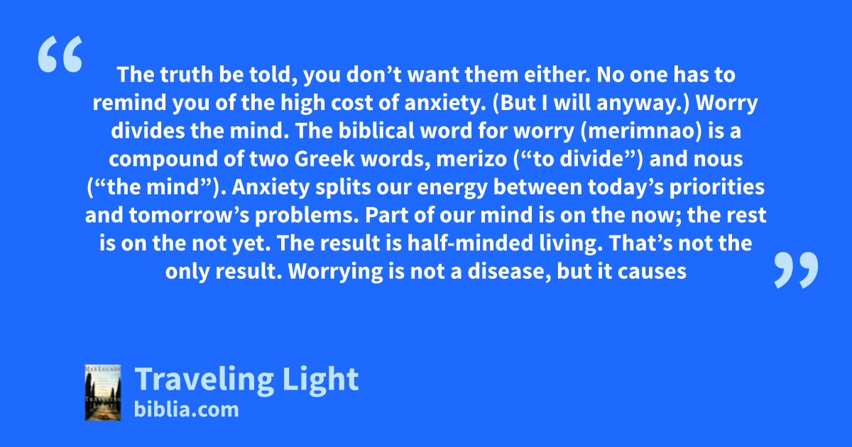 The truth be told, you don’t want them either. No one has to remind you of the high cost of anxiety. (But I will anyway.) Worry divides the mind. The biblical word for worry (merimnao) is a compound of two Greek words, merizo (“to divide”) and nous (“the mind”). Anxiety splits our energy between today’s priorities and tomorrow’s problems. Part of our mind is on the now; the rest is on the not yet. The result is half-minded living. That’s not the only result. Worrying is not a disease, but it causes