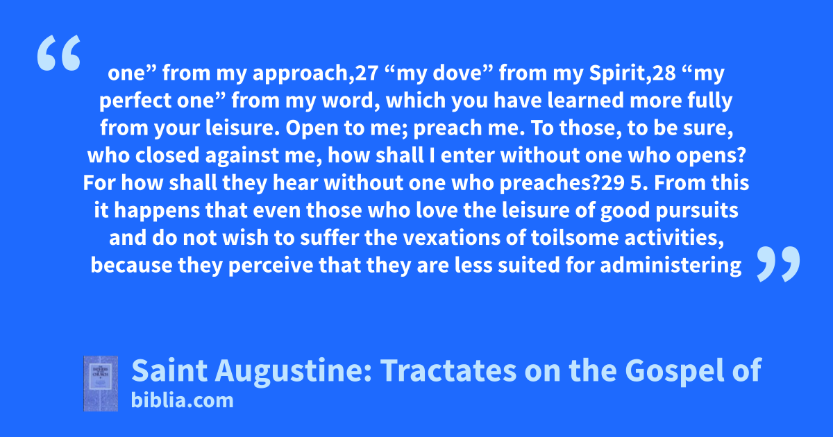 one” from my approach,27 “my dove” from my Spirit,28 “my perfect one” from my word, which you have learned more fully from your leisure. Open to me; preach me. To those, to be sure, who closed against me, how shall I enter without one who opens? For how shall they hear without one who preaches?29 5. From this it happens that even those who love the leisure of good pursuits and do not wish to suffer the vexations of toilsome activities, because they perceive that they are less suited for administering