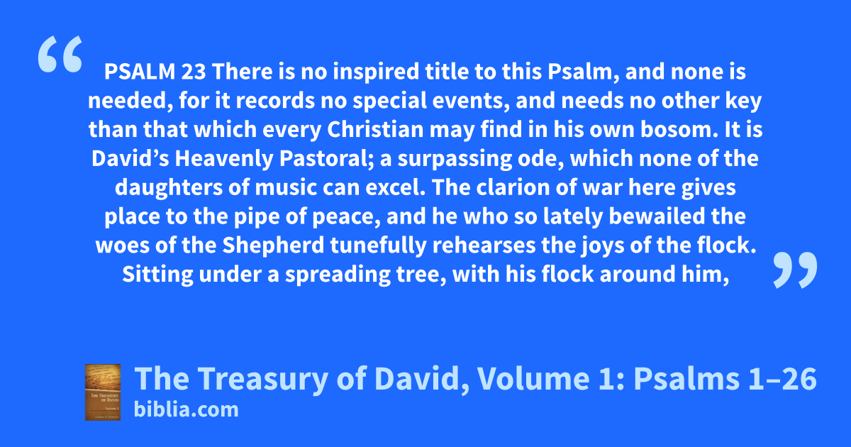 PSALM 23 There is no inspired title to this Psalm, and none is needed, for it records no special events, and needs no other key than that which every Christian may find in his own bosom. It is David’s Heavenly Pastoral; a surpassing ode, which none of the daughters of music can excel. The clarion of war here gives place to the pipe of peace, and he who so lately bewailed the woes of the Shepherd tunefully rehearses the joys of the flock. Sitting under a spreading tree, with his flock around him,