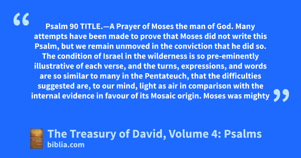 Psalm 90 TITLE.—A Prayer of Moses the man of God. Many attempts have been made to prove that Moses did not write this Psalm, but we remain unmoved in the conviction that he did so. The condition of Israel in the wilderness is so pre-eminently illustrative of each verse, and the turns, expressions, and words are so similar to many in the Pentateuch, that the difficulties suggested are, to our mind, light as air in comparison with the internal evidence in favour of its Mosaic origin. Moses was mighty