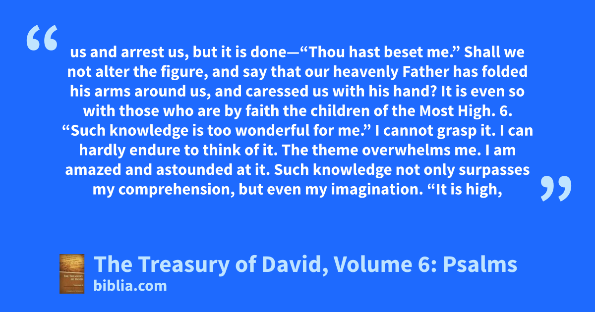 us and arrest us, but it is done—“Thou hast beset me.” Shall we not alter the figure, and say that our heavenly Father has folded his arms around us, and caressed us with his hand? It is even so with those who are by faith the children of the Most High. 6. “Such knowledge is too wonderful for me.” I cannot grasp it. I can hardly endure to think of it. The theme overwhelms me. I am amazed and astounded at it. Such knowledge not only surpasses my comprehension, but even my imagination. “It is high,