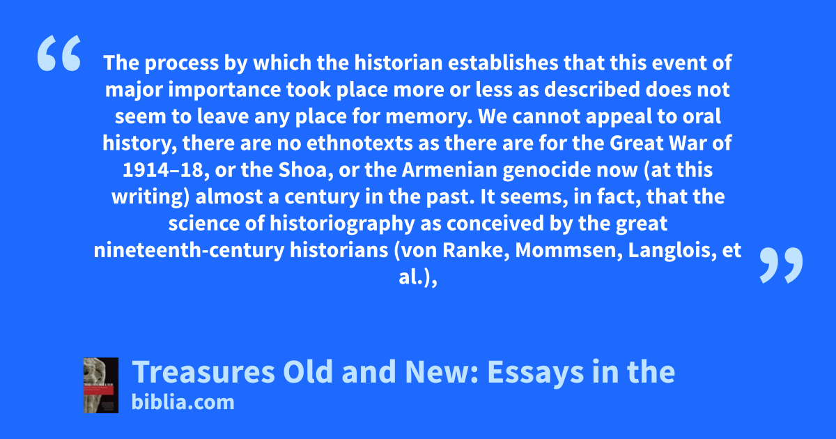 The process by which the historian establishes that this event of major importance took place more or less as described does not seem to leave any place for memory. We cannot appeal to oral history, there are no ethnotexts as there are for the Great War of 1914–18, or the Shoa, or the Armenian genocide now (at this writing) almost a century in the past. It seems, in fact, that the science of historiography as conceived by the great nineteenth-century historians (von Ranke, Mommsen, Langlois, et al.),