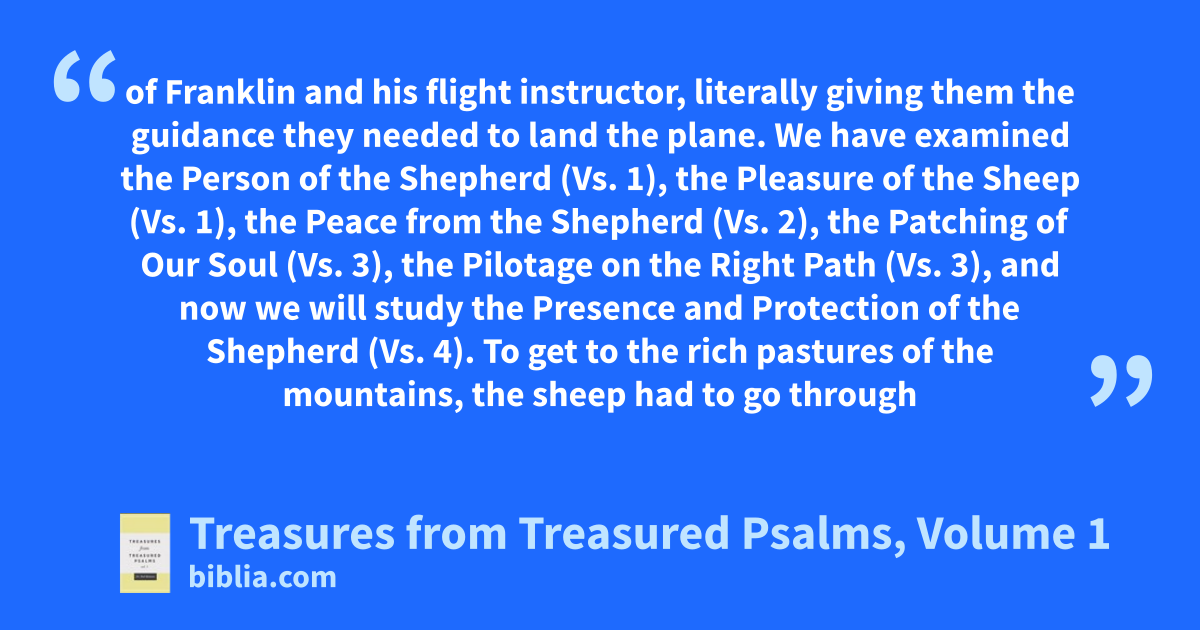 of Franklin and his flight instructor, literally giving them the guidance they needed to land the plane. We have examined the Person of the Shepherd (Vs. 1), the Pleasure of the Sheep (Vs. 1), the Peace from the Shepherd (Vs. 2), the Patching of Our Soul (Vs. 3), the Pilotage on the Right Path (Vs. 3), and now we will study the Presence and Protection of the Shepherd (Vs. 4). To get to the rich pastures of the mountains, the sheep had to go through
