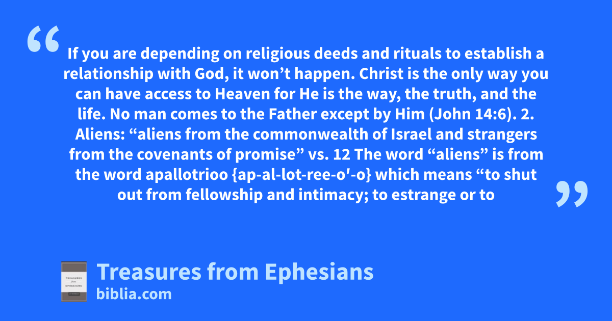 If you are depending on religious deeds and rituals to establish a relationship with God, it won’t happen. Christ is the only way you can have access to Heaven for He is the way, the truth, and the life. No man comes to the Father except by Him (John 14:6). 2. Aliens: “aliens from the commonwealth of Israel and strangers from the covenants of promise” vs. 12 The word “aliens” is from the word apallotrioo {ap-al-lot-ree-oʹ-o} which means “to shut out from fellowship and intimacy; to estrange or to