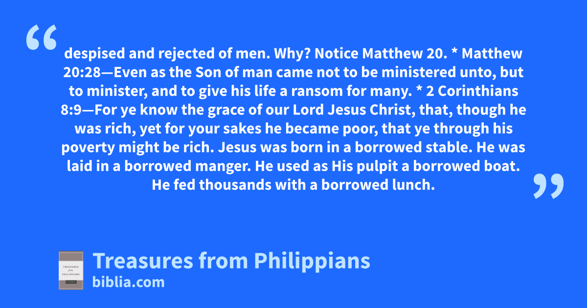 despised and rejected of men. Why? Notice Matthew 20. * Matthew 20:28—Even as the Son of man came not to be ministered unto, but to minister, and to give his life a ransom for many. * 2 Corinthians 8:9—For ye know the grace of our Lord Jesus Christ, that, though he was rich, yet for your sakes he became poor, that ye through his poverty might be rich. Jesus was born in a borrowed stable. He was laid in a borrowed manger. He used as His pulpit a borrowed boat. He fed thousands with a borrowed lunch.